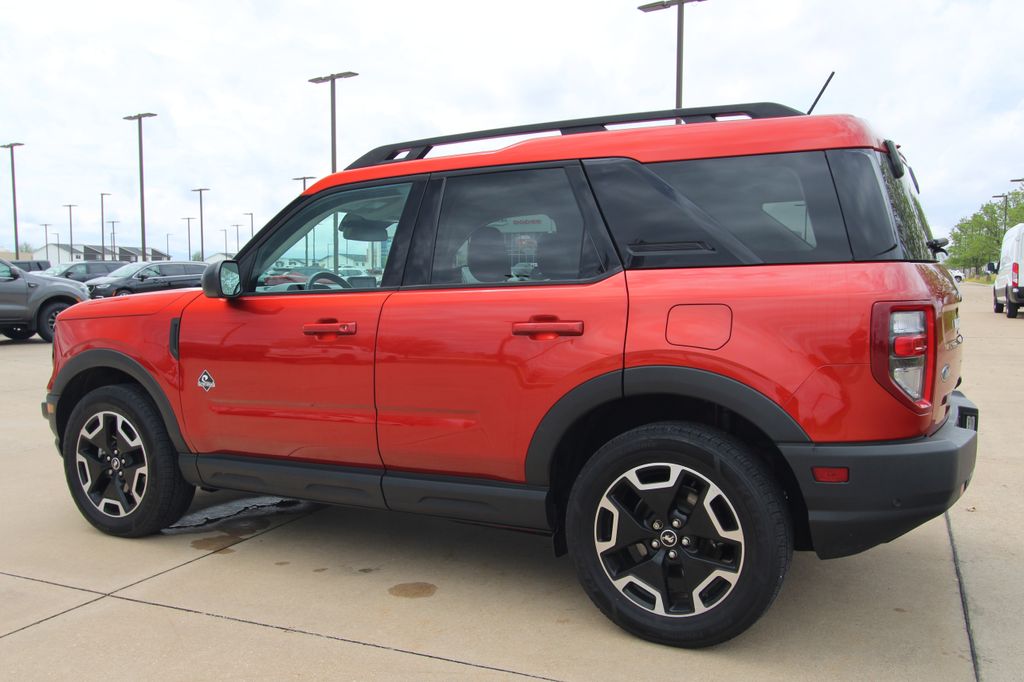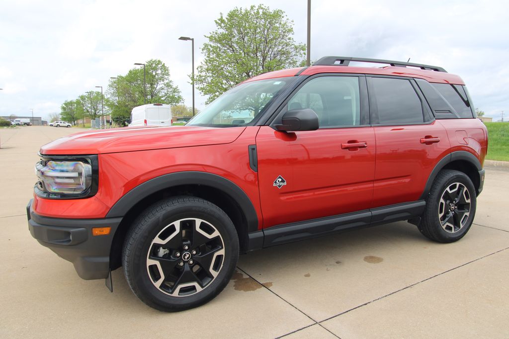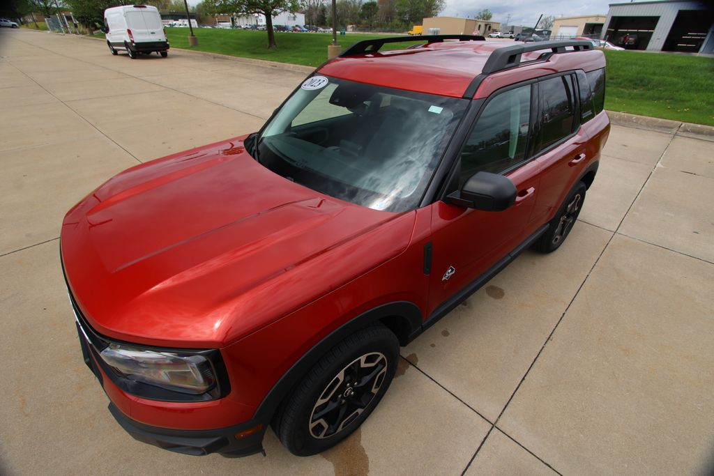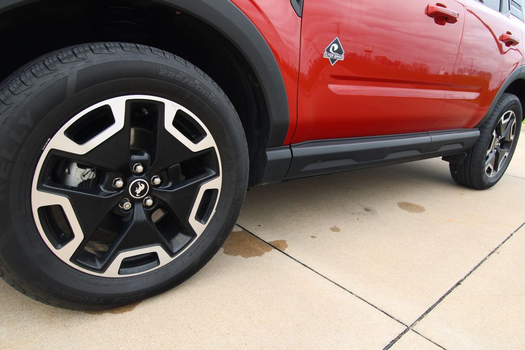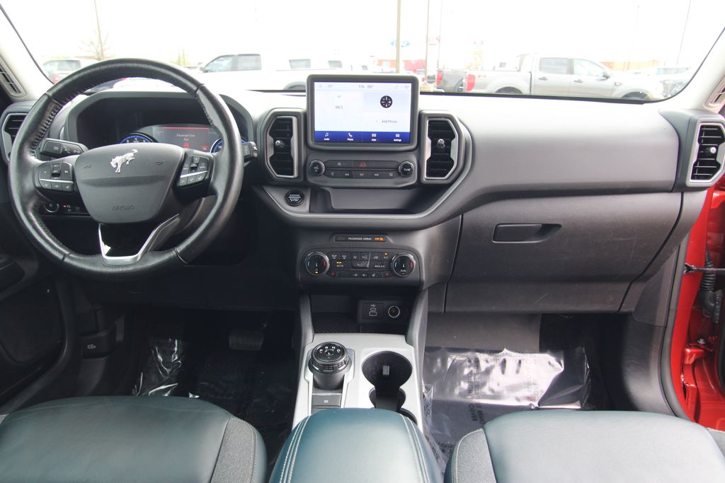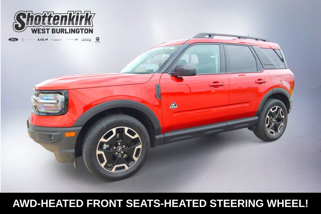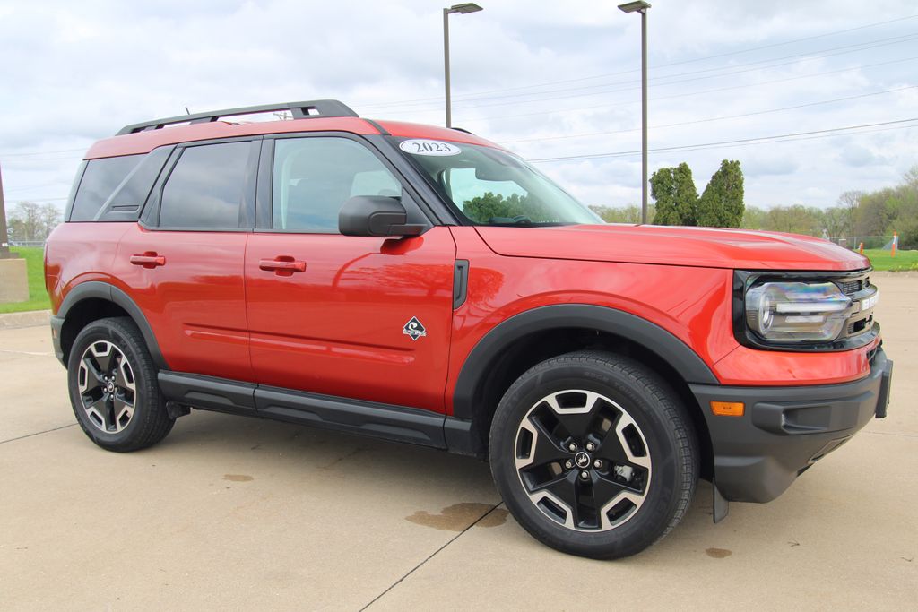 2023 Ford Bronco Sport Outer Banks Hot Pepper Red Tinted Clearcoat 4D Sport Utility 1.5L EcoBoost 8-Speed Automatic 4WD Outer Banks This vehicle comes well equipped with Equipment Group 300A, 3.80 Axle Ratio, 4-Wheel Disc Brakes, 4G LTE Wi-Fi Hotspot Credit, 6 Speakers, ABS brakes, Air Conditioning, Alloy wheels, AM/FM radio: SiriusXM, AM/FM Stereo, Auto High-beam Headlights, Auto-dimming Rear-View mirror, Automatic temperature control, Brake assist, Compass, Delay-off headlights, Driver door bin, Driver vanity mirror, Dual front impact airbags, Dual front side impact airbags, Electronic Stability Control, Emergency communication system: SYNC 3 911 Assist, Four wheel independent suspension, Front & Rear Floor Liners w/Carpet Mats, Front anti-roll bar, Front Bucket Seats, Front Center Armrest, Front dual zone A/C, Front fog lights, Front reading lights, Fully automatic headlights, Heated door mirrors, Heated front seats, Heated steering wheel, Illuminated entry, Knee airbag, Leather Trimmed Heated Sport Contour Bucket Seats, Low tire pressure warning, Memory seat, Occupant sensing airbag, Outside temperature display, Overhead airbag, Overhead console, Panic alarm, Passenger door bin, Passenger vanity mirror, Power door mirrors, Power driver seat, Power passenger seat, Power steering, Power windows, Radio data system, Rain sensing wipers, Rear anti-roll bar, Rear Parking Sensors, Rear reading lights, Rear seat center armrest, Rear window defroster, Rear window wiper, Remote keyless entry, Security system, SiriusXM, Speed control, Speed-sensing steering, Speed-Sensitive Wipers, Split folding rear seat, Steering wheel mounted audio controls, SYNC 3 Communications & Entertainment System, SYNC 3/Apple CarPlay/Android Auto, Tachometer, Telescoping steering wheel, Tilt steering wheel, Traction control, Trip computer, Variably intermittent wipers, and Wheels: 18" Ebony Black-Painted Aluminum.