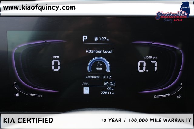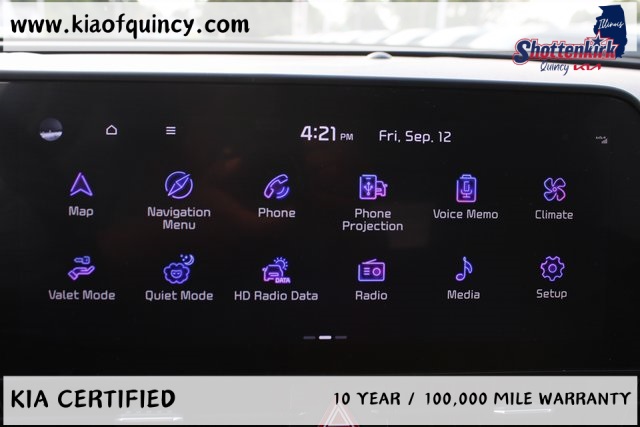 CARFAX One-Owner. Clean CARFAX. NEW PRICE!!!!, Local Trade In, 1 OWNER, Balance of Factory Warranty, LOW MILES, Like New Inside and Out, KIA CERTIFIED, LEATHER SEATS, HEATED SEATS, BLUETOOTH, REMOTE START, 172 Point Inspection Completed, BACKUP CAMERA, POWER SEAT, MUST SEE!!!, HARD TO FIND!!!, BLIND SPOT SYSTEM, SHOTTENKIRK PREMIER ADAVANTAGE*, Apple Car Play / Android Auto, Forward Collision Alert, LANE DEPARTURE / LANE KEEP ASSIST.25/33 City/Highway MPGKia Certified Pre-Owned means you not only get the remainder of the 5yr/60,000 manufacturer's warranty, but also the reassurance of up to a 10yr/100,000 mile limited powertrain warranty. Kia Certified vehicles have passed a 150 point inspection and reconditioning process. They also include 24/7 roadside assistance, trip-interruption services, rental car benefits, and a complete vehicle history report.All of our New and Pre-Owned Vehicles come with added value, our exclusive Premier Advantage* . This includes Wheel Repair, Dent and Ding Repair, Front Windshield Repair, and Key Replacement! Exclusive of published sales price, all vehicles are equipped with the NitroFill product, of nitrogen based gas in the tires for extended tire life and enhanced fuel economy. Beautiful Quincy, IL is located on the Mississippi River on the Illinois & Missouri border. Our mission at Shottenkirk Automotive is to make sure you are 100% completely satisfied with your ownership experience. We want you to be completely satisfied; not only with the vehicle you buy, but also the way you buy your vehicle. Our professional sales & management staff will work hard to make your visit to Shottenkirk Automotive a great car buying experience. Such a great experience that you will have the confidence to buy from us again, and also tell your friends & family to do the same.